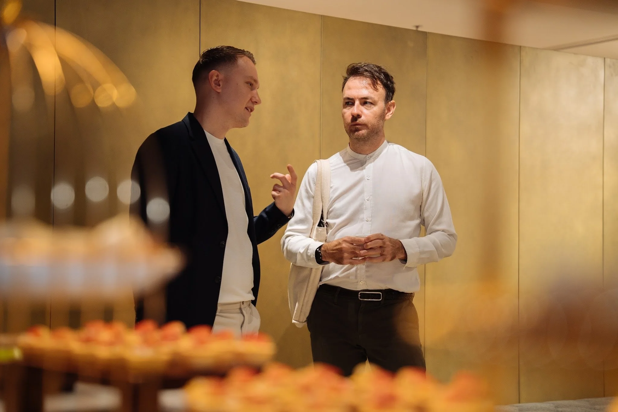Ông Peter Schmidt (trái) – đại diện hãng đèn XAL lighting – đơn vị cung cấp thiết bị và giải pháp chiếu sáng cho các tác phẩm sơn mài trong buổi trò chuyện “Illuminated Essence – Vietnamese Lacquer Through Light”.