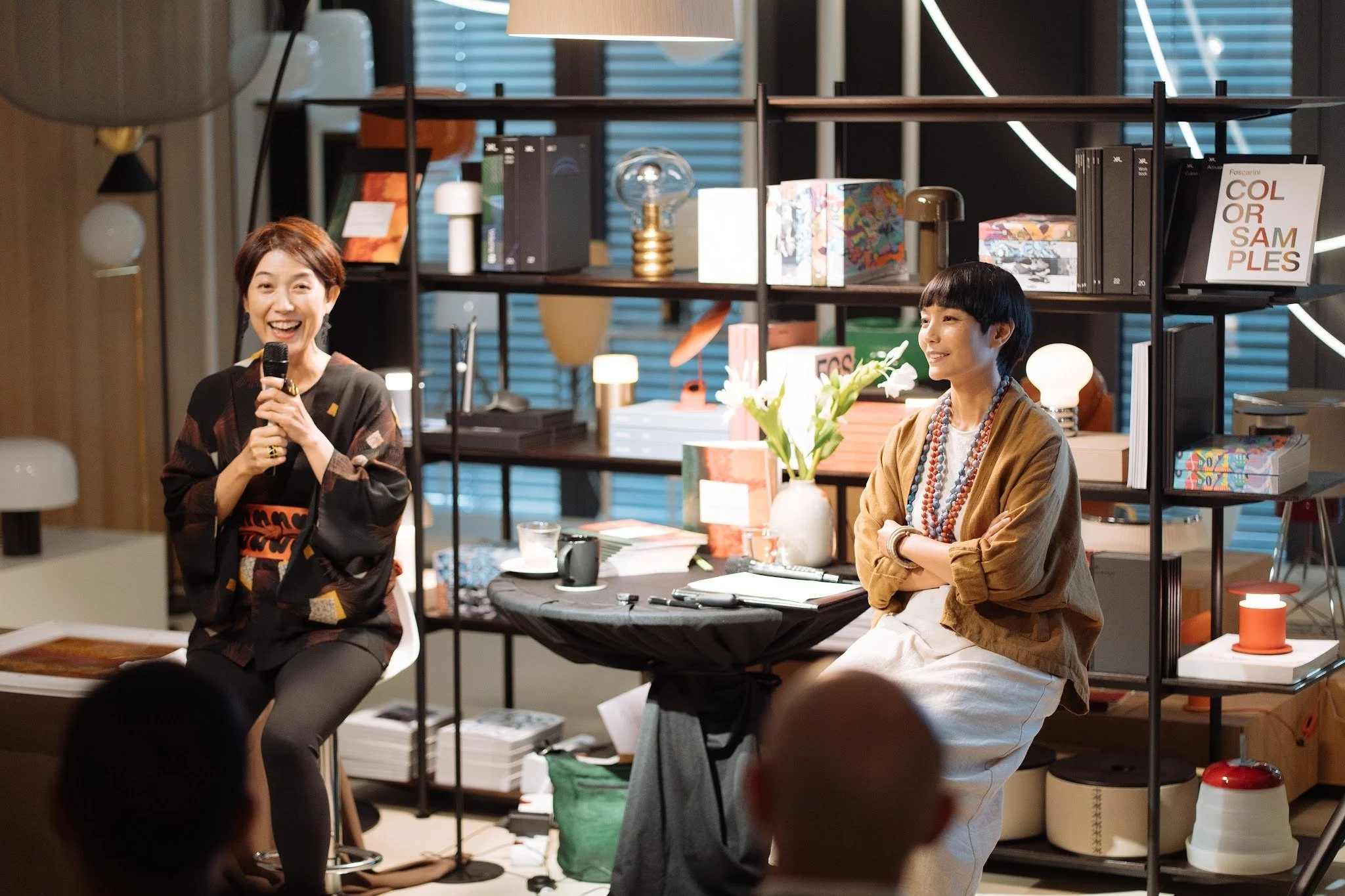 Không gian buổi trò chuyện “Illuminated Essence – Vietnamese Lacquer Through Light” về nghệ thuật sơn mài của nghệ sỹ Saeko Ando (trái) và nhà báo – Điều phối Trương Uyên Ly (phải).