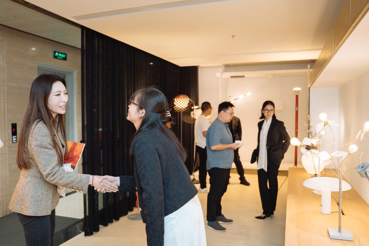 Khách mời lắng nghe chia sẻ về con đường sự nghiệp của nghệ sĩ, trong không gian nhiều cảm xúc của showroom chiếu sáng tamminh-light. Wine reception và trà chiều và bánh ngọt hảo hạng mang thêm phần ấm cúng cho không gian sự kiện.